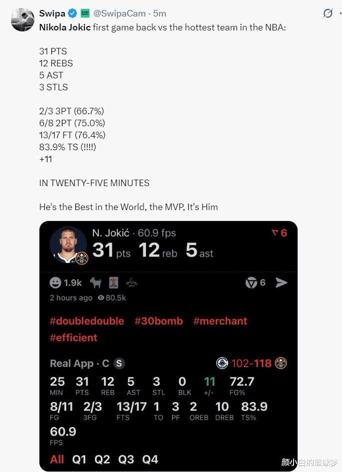 尼古拉-约基奇自12月30日受伤后,他已经足足休息了32天,他合计缺席了16场常规赛,他之后只有一场的空间不然就无缘评选常规赛MVP、最佳阵容等奖项,他复出的这个时限肯定也是为了评奖。首节约老师登场就展现了极强的统治力,4中3+三分1中1拿到9分4篮板1助攻。